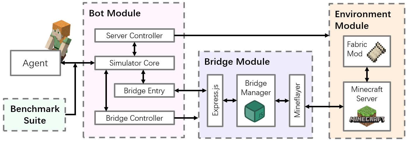 我们搭建了一个Simulator作为Agent与Minecraft游戏之间的桥梁,支持128+个Agent加入,引入了多模态的数据,包括视觉、听觉、触觉等。以Code为Action Space,提供Low-level和High-level两套Action。