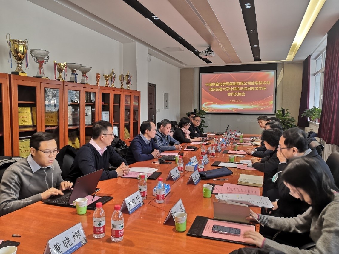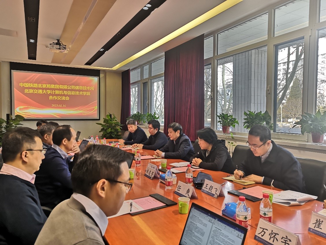 2023年2月16日上午,中国铁路北京局集团有限公司信息技术所(以下简称“中国铁路北京局信息技术所”)主任李伟、总工程师刘韶霞、副主任张海泉等一行六人来访av影片 ,与av影片 院长蔡伯根、大数据研究院院长林友芳、av影片 副院长景丽萍等八人,就大数据方向培训等事宜进行合作交流。