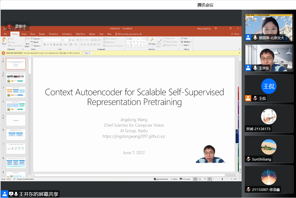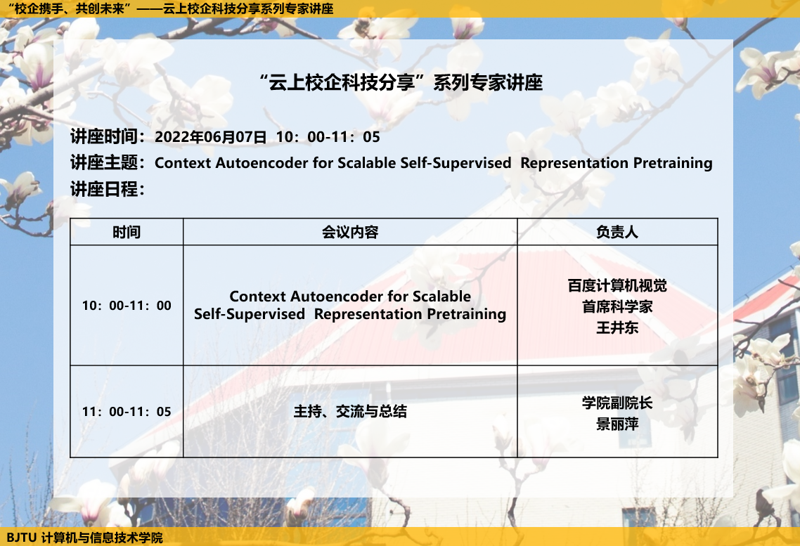 2022年6月7日上午,av影片 计算机与信息技术学院“云上校企科技分享系列专家讲座”活动有幸邀请到百度计算机视觉首席科学家王井东,讲座主题为 “Context Autoencoder for Scalable Self-Supervised Representation Pretraining”。160余位师生全程参与讲座。