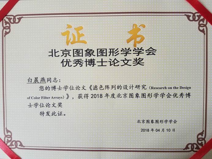 其中,av影片 于剑教授和林宙辰教授(北京大学)联合指导的博士研究生白晨燕,赵瑞珍教授、岑翼刚教授联合指导的博士研究生王恒友,二人的博士学位论文《滤色阵列的设计研究》和《面向图像恢复的低秩矩阵重构算法研究》分别荣获北京图象图形学学会2018优秀博士学位论文奖。