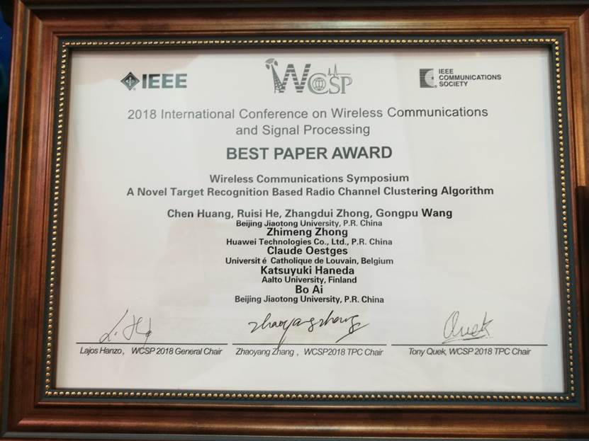 2018年10月17至19日,第十届无线通信与信号处理国际学术会议在杭州召开,av影片 2016级博士生生黄晨在何睿斯副教授和钟章队教授指导下撰写并发表的论文“A Novel Target Recognition Based Radio Channel Clustering Algorithm”获这次会议最佳论文奖。本次会议共收到700余篇投稿,最后共录用287篇文章。