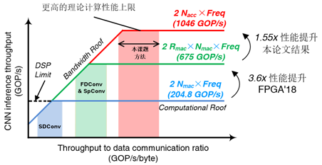 时域卷积SDConv方法的问题在于,采用该方法设计的硬件加速器的最高性能受到FPGA片上DSP资源数量的限制。如图(2)所示的roofline模型所示,当FPGA片上DSP资源对应的乘累加单元(MAC)总数为Nmac时,处理器的推理运算的最高性能不会超过2×Nmac×Freq,其中Freq为处理器的工作频率;该理论性能极限被称为computational roof。目前,基于时域卷积方法的硬件硬件加速器设计性能已接近理论计算性能极限,单从架构设计方面已经无法进一步提升神经网络硬件加速器的性能。因此,最新的学术研究开始转向研究基于新型卷积算法的加速器设计,包括如频域卷积(Frequency-Domain Convolution,FDConv)和稀疏卷积(Sparse Convolution,SpConv)。这两种方法都是通过设计新型的卷积计算方法,在算法层面压缩卷积运算所需要执行的乘累加运算数目,如减少Rmac倍,则理论上对应的硬件加速器性能可提升Rmac倍(通常也称Rmac为算法加速比)。例如FPGA’18的最新论文[3]设计了一种高效的频域卷积算法,与时域卷积算法相比,该方法可以将卷积运算中乘累加运算数量压缩3.6倍,从而将理论计算性能极限提升了3.6倍,论文在Stratix-VA7 FPGA上进行了实验,仅使用256个DSP单元,实现了高达669 GOP/s的卷积神经网络推理性能。