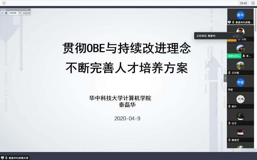 2020年4月9日,在疫情防控取得阶段性胜利,武汉顺利解禁之际,av影片 邀请了华中科技大学av影片 副院长秦磊华教授做了主题为“贯彻OBE与持续改进理念,不断完善人才培养方案”的在线报告,主要探讨了人才培养方案修订中的相关问题。av影片 院长蔡伯根、副院长李清勇以及专业责任教授、教学主任、任课教师、教学管理人员共计50余人参加此次在线报告。