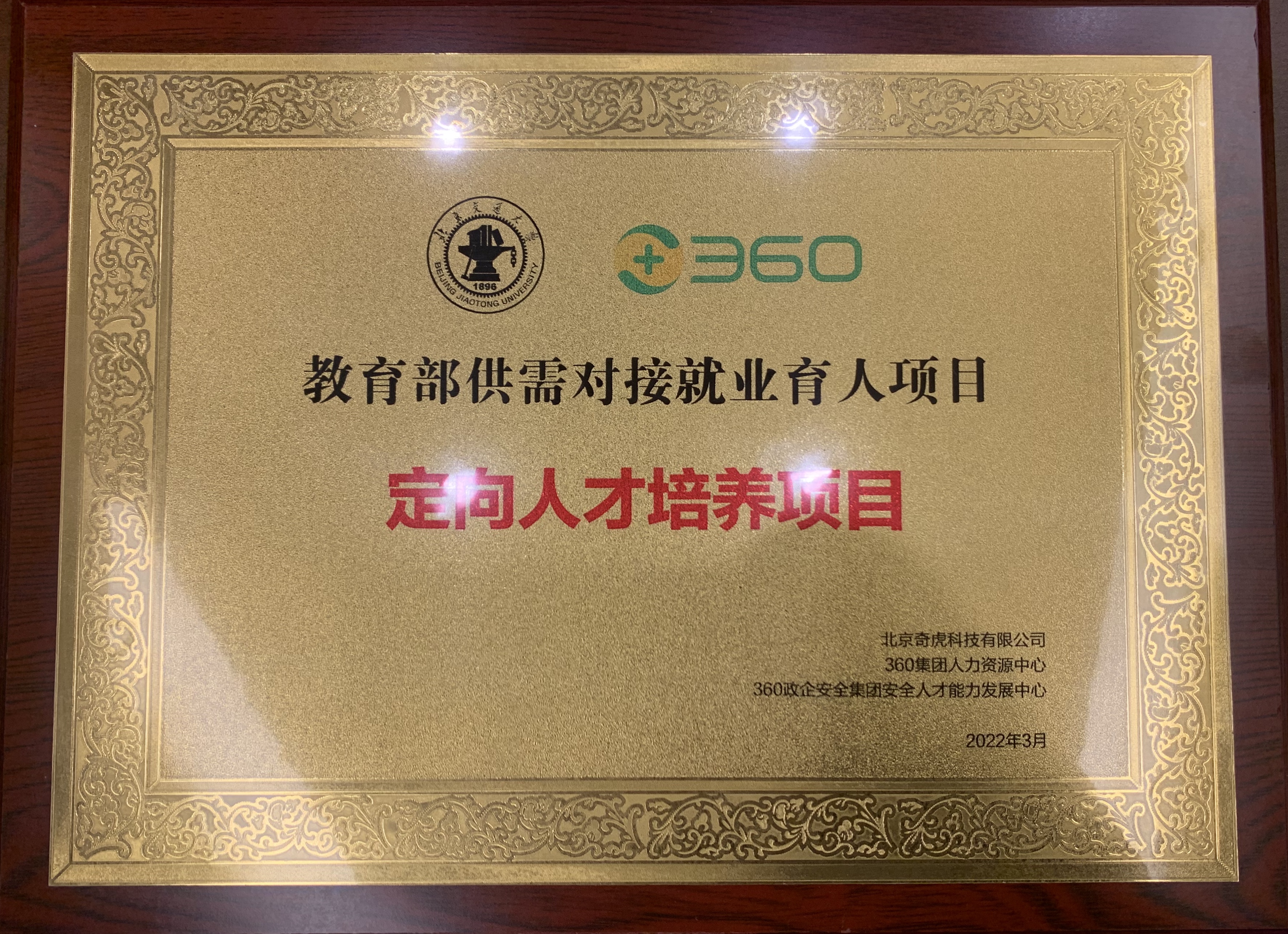 教育部高校学生司2021年首次实施供需对接就业育人项目,av影片 与360公司合作设立定向人才培养项目—av影片 信息安全专业人才培养和实践能力提升项目,面向大三大四学生进行专业实训课程培养,合办网络安全攻防特色定向人才培养班。