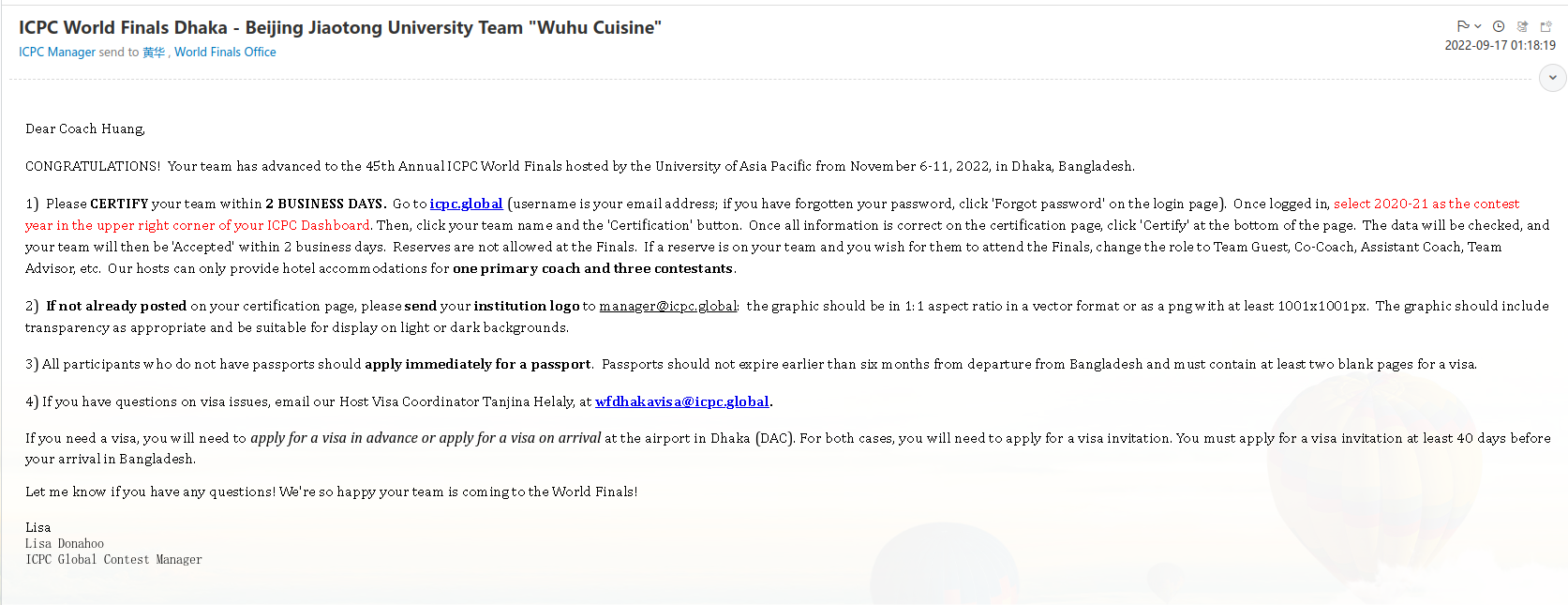 图2 ICPC总部通知av影片 晋级全球总决赛的邮件