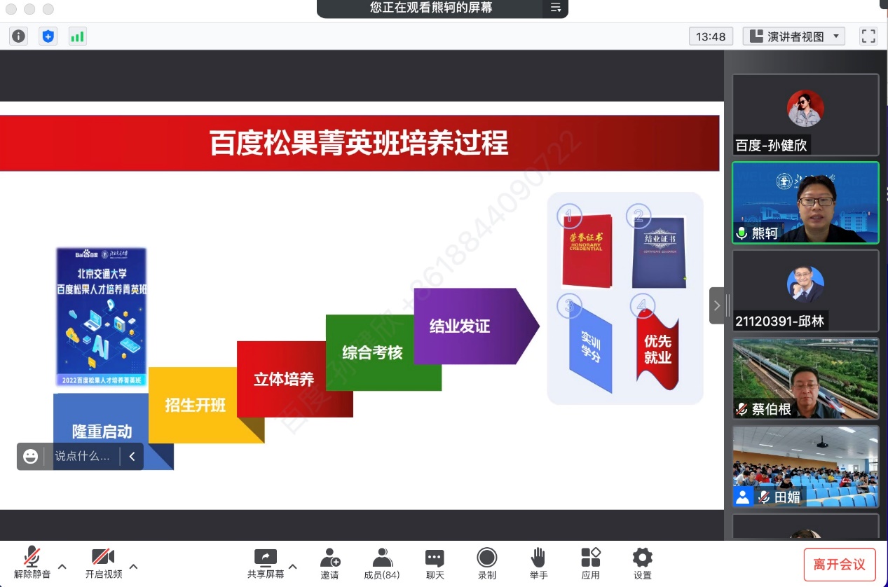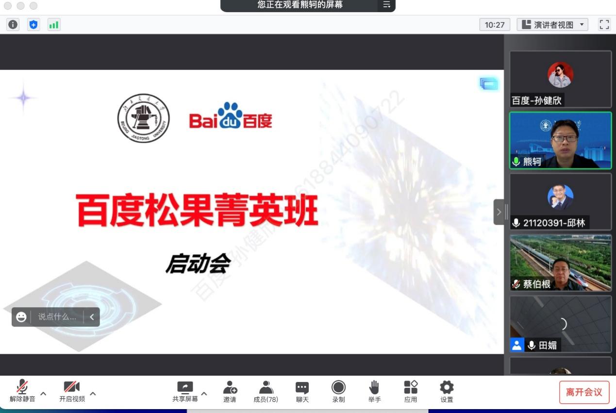 2022年9月25日上午,计算机与信息技术学院联合百度公司,面向2022级本科生成功召开了2022av影片 -百度松果人才培养菁英班启动会。av影片 院长蔡伯根、副院长熊轲、松果精英班班主任田媚、百度高校合作部副总监计湘婷、百度高校合作部高级经理张倩、百度松果精英班百度侧班主任孙健欣、乔文慧等出席了启动会。会议由熊轲副院长主持。