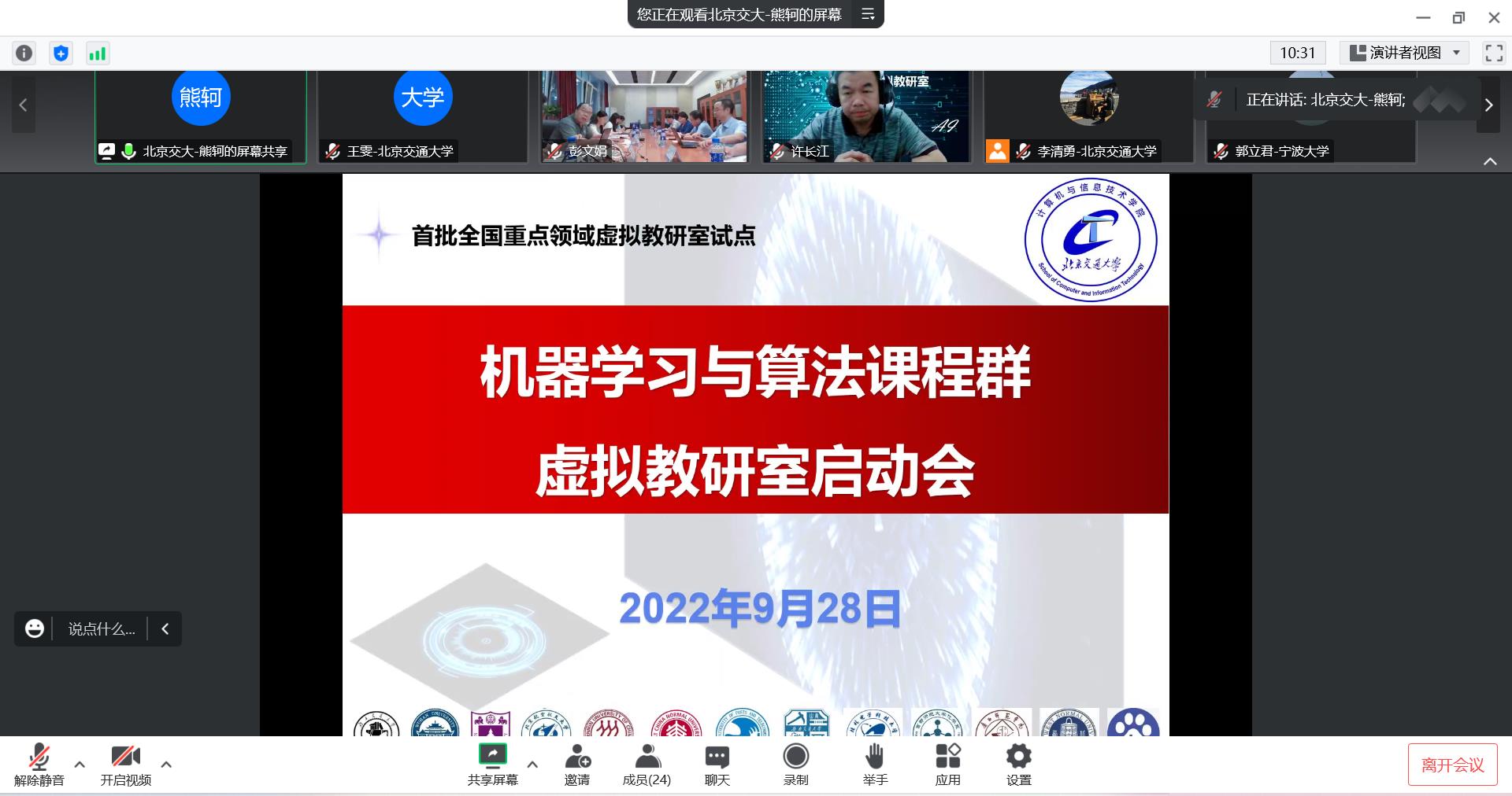 机器学习与算法课程群虚拟教研室于2022年9月28日下午通过线上线下结合的方式召开建设启动会。会议由av影片 计算机与信息技术学院副院长熊轲教授主持,重点领域教学资源建设项目管理办公室副主任许长江、av影片 本科生院副院长宋瑞、av影片 计算机与信息技术学院院长蔡伯根参加会议并致辞,av影片 、武汉大学、南京大学、北京航空航天大学、北京邮电大学、西南交通大学、中国矿业大学、华中师范大学、桂林电子科技大学、宁波大学、西北师范大学和武夷学院等虚拟教研室成员单位的专家和教师代表出席了会议。