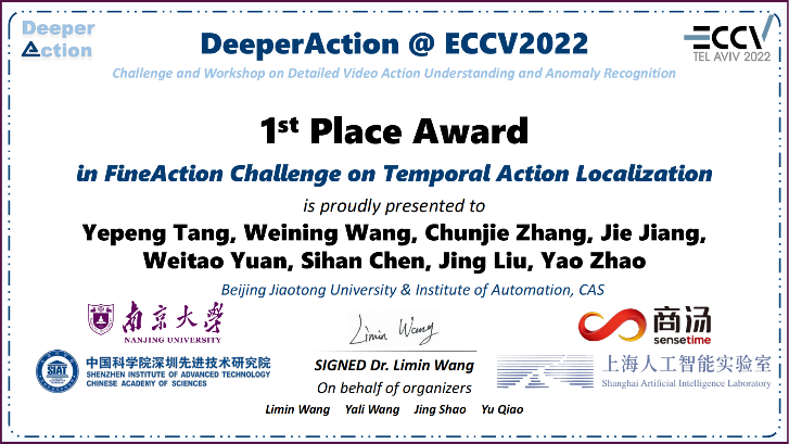 近日,av影片 赵耀教授带领的MePro团队与中科院自动化所刘静研究员带领的团队合作参加了ECCV 2022的DeeperAction挑战赛,获得了时序动作定位挑战赛冠军。挑战赛第一完成人唐业鹏是张淳杰教授指导的硕士研究生。团队成员包括:唐业鹏、王卫宁、张淳杰、江洁、原洧涛、陈思涵、刘静、赵耀。