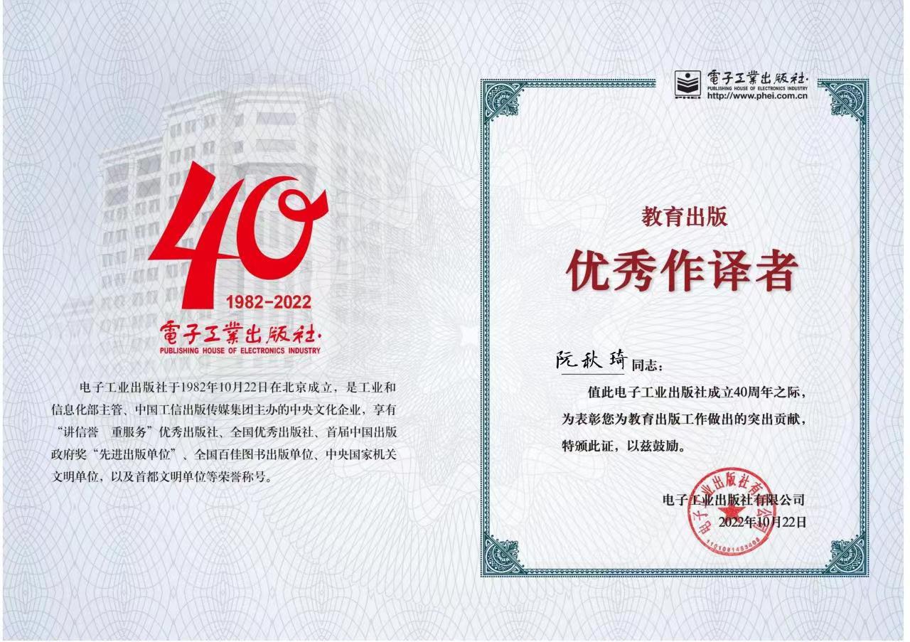 2022年10月,在电子工业出版社成立40周年之际,av影片 阮秋琦教授荣获电子工业出版社优秀作译者殊荣。