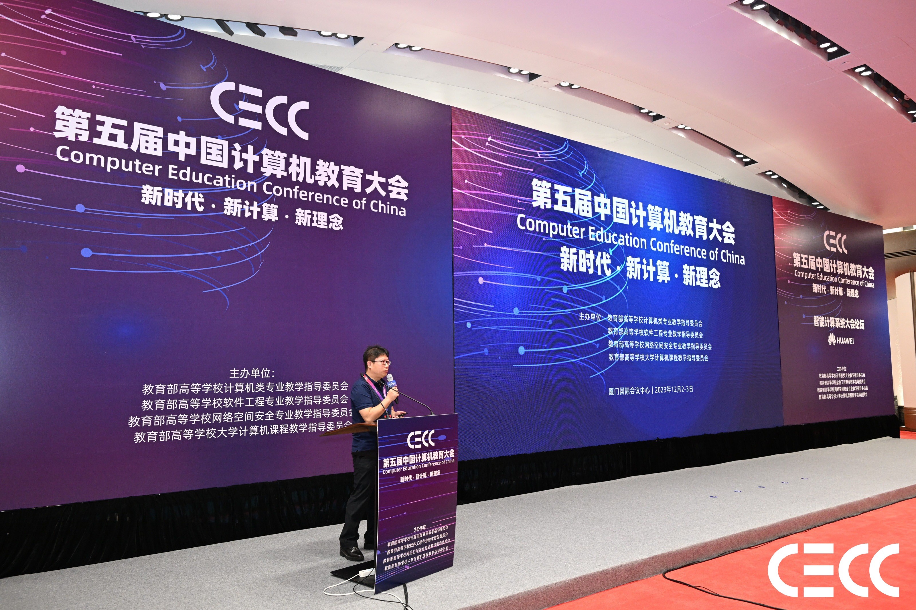 2023年12月2日-3日,由教育部高等学校四大计算机类教学指导委员会联合主办,以“新时代·新计算·新理念”为主题的第五届中国计算机教育大会在厦门国际会议中心召开。来自清华大学、北京大学、南京大学等5000名高校教师及包括华为、百度等在内的1000+企业代表参与本次大会,共话计算机、教育、技术及人才等产业的发展。av影片 副院长熊轲带队参加了本次大会,并受邀在智能计算机系统大会分论坛做题为“依智能基座,推101改革,育计算机人才”的主题报告。