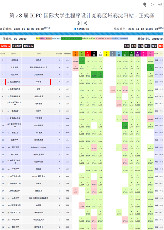 48ICPC国际大学生程序设计竞赛区域赛沈阳站榜单